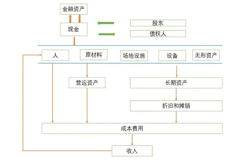 从现金开始,经过转化为各类资产、产生成本费用、获得收入,收入又可以再次转化为现金(比如销售回款),然后现金又可以去补充或扩大各类资产(包括金融资产、重新投入人、材料等方面),形成一个持续的资金循环,支撑企业不断运营和发展。