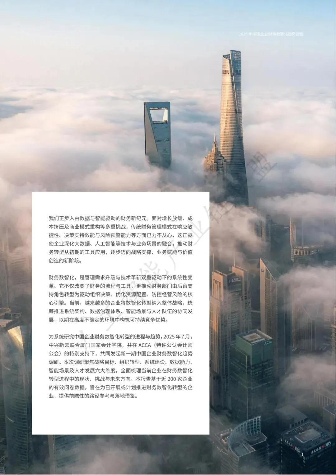 中兴新云长期深耕于财务数智化领域。今年,我们再次联合厦门国家会计学院与ACCA(特许公认会计师公会),共同开展2025年中国企业财务数智化趋势调研,延续这一具有重要实践价值的研究工作。我们也期待与更多中国企业携手同行,共同推进财务数智化建设,以财务现代化支撑企业高质量发展。