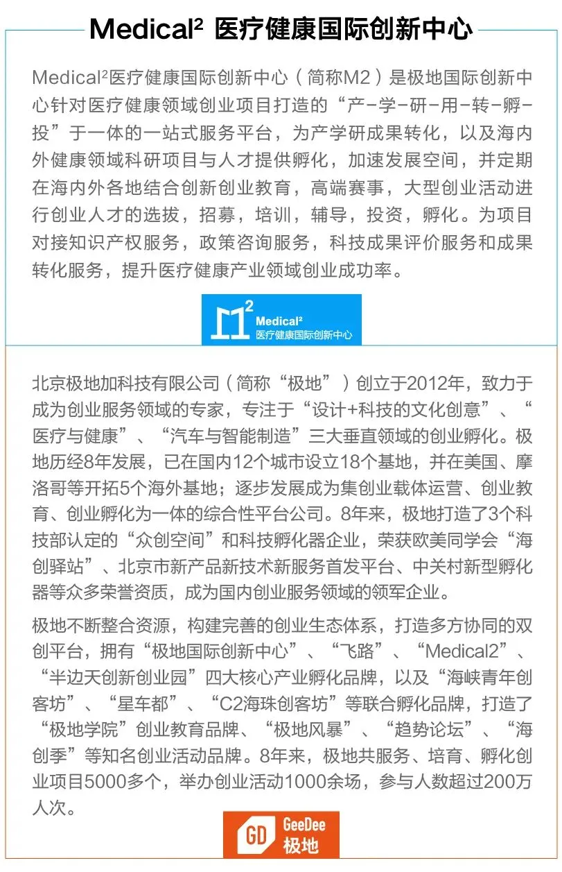 M²医疗健康全球创新创业加速营由M²医疗健康国际创新中心主办,每年一期,面向全球招募医疗健康领域科技创新者和初创者,旨在通过系统的课程学习与项目对接,全面提升医疗健康领域创新创业者的创新思维和创业能力,培育“强专业、懂管理、知市场、善创新、会创业”的医疗健康产业复合型人才,并通过帮助有创业梦想的科研人才最终实现发现独角兽企业的目的。