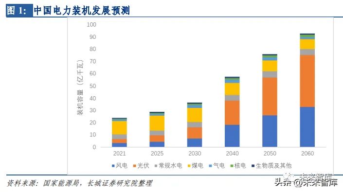 电力系统是我国当前最主要的碳排放源之一。未来电力系统建设的目标就是构建以新能 源为主体的新型电力系统,风电、光伏、水电、核电等无碳能源将逐步取代化石能源成 为发电的主力。截至 2021 年底,我国电力总装机 23.8 亿千瓦,其中风电光伏装机分别为 3.3 亿千瓦以及 3.1 亿千瓦,火电装机(含生物质)约 13 亿千瓦。根据对人口变化、GDP 增长、电源装机结构转变及电能替代、人均用电量增加等因素的综合预测,我们预计至 2030 年,我国电力装机规模将达 36 亿千瓦,其中风电 8 亿千瓦,光伏 10 亿千瓦,占比 约 50%。至 2060 年,我国电力装机规模将达 90~95 亿千瓦,其中风电 33 亿千瓦,光伏 42 亿千瓦,占比超过 80%。