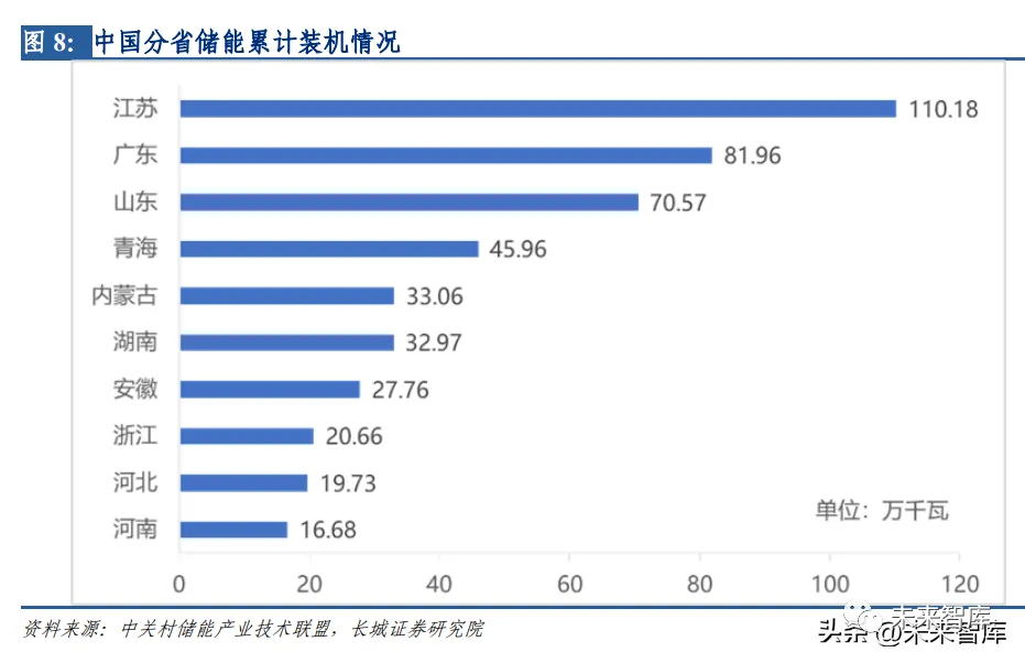 我国截至 2021 年底,电力储能装机约 4600 万千瓦,相比于 2020 年增长 30%,占全球电 力系统储能装机量的 22%。2021 年全年新增电力储能装机约 1000 万千瓦,其中抽水蓄能 增加约 800 万千瓦,新型储能装机增加约 200 万千瓦。在新型储能的 580 万装机中,锂 离子电池占比最高,接近 90%,折合装机规模约 520 万千瓦。其余新型储能中,铅蓄电 池和压缩空气储能占比相对较大。从各省已投运新型储能装机情况看,江苏省装机量第一,已超过 100 万千瓦,广东省和 山东省次之,其余有较大装机的省份包括青海、内蒙古、湖南、安徽等。