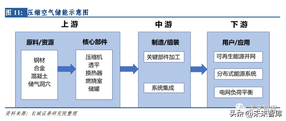 产业链及成本:压缩空气储能的上游主要是原材料与核心部件(模具、铸件、管 道、阀门、储罐等)的生产加工、装配、制造行业,属于机械工业的一部分,但 涉及压缩空气储能本身特性和性能要求,对基础部件的设计、加工要求较为严格。中游主要是关键设备(压缩机、膨胀机、燃烧室、储热/换热器等)设计制造、系统 集成控制相关的行业,属于技术密集型的高端制造业,具有多学科、技术交叉等 特性。下游主要是用户对压缩空气储能系统的使用和需求,涉及常规电力输配送、 可再生能源大规模接入、分布式能源系统、智能电网与能源互联网等多个行业领 域。