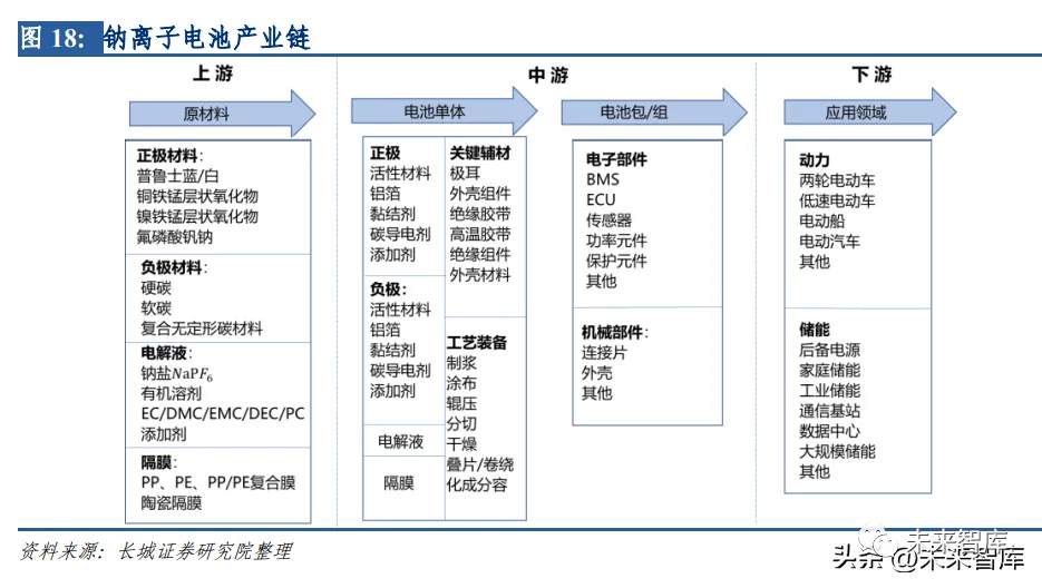 钠离子电池产业链结构与锂离子电池相似,但产业布局还处于初级阶段,尚无大规模电 力系统储能项目开工建设。与锂离子电池相比,钠离子电池原材料丰富,综合成本降低 约 20%,但电池能量密度较低,产业链配套尚不完善,因此发展趋势主要集中在能量密 度提升以及通过产业链建设降低成本两个方面。铅炭电池在传统铅酸电池的负极活性物质中加入碳添加剂,全面提升了传统铅酸电池的 性能表现,同时由于较低的成本,使其在规模化电力储能方面又赢得新的发展机会。未 来的铅炭电池技术发展将集中在副反应控制、铅炭电极在充放电过程中的结构转变以及 铅炭电池的最终失效模式上。随着它的性能改进提升,铅炭电池仍可能有所作为。