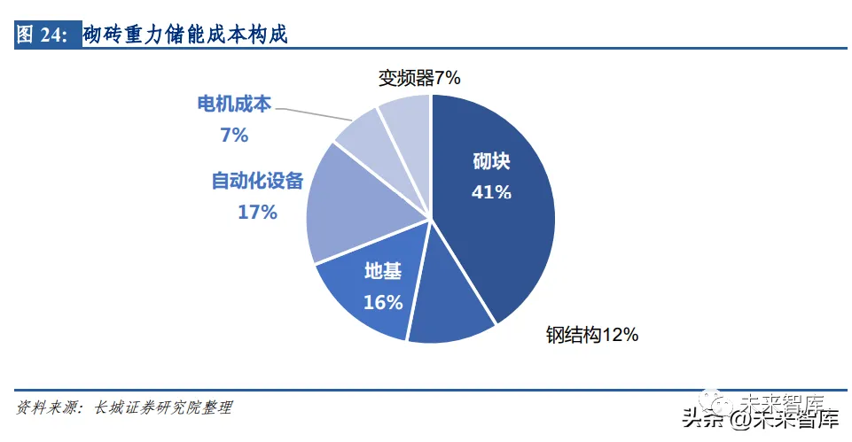 固体介质的重力储能是近期重力储能商业化的主要发展方向,水介质的新型重力 储能技术尚停留在理论研究阶段,除传统抽蓄外的新型水介质重力储能目前尚未 有商业化的产品。Energy Vault 采用的提升砌块作为存储电能的方式已掌握较为成熟的技术,并已 开始应用于小规模示范项目中,但尚未出现大规模应用,其技术成熟度有待示范 项目的验证。若能有较成功的示范,砌块重力储能具有可扩展性高、度电成本较 低的优势,在中长时储能中有相对广阔的应用前景。矿井重力储能利用废弃矿井进行能量存储,矿井高差通常比人工构筑物更大,如 果将数百米深的废弃矿井利用部署重力储能,其储能效率和储能密度均能够超越 以人工构筑高差部署重力储能的方式。