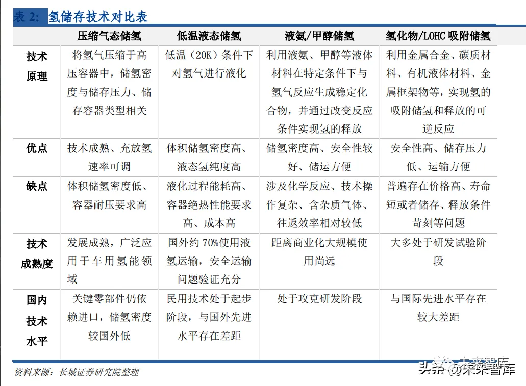 此外,还可以将绿氢通过合成氨工艺或氢制甲醇工艺转化为氨或甲醇进行储存,使用时 再通过氨催化裂解和甲醇催化裂解制氢,或直接将氨、甲醇进行应用。液氨的沸点为 -33.5℃,甲醇的沸点为-64.8℃,因此液化及储存成本远低于氢,另一方面氨和甲烷的合 成及裂解技术成熟,只需针对可再生能源制氢工艺进行部分优化调整。更重要的是,合 成甲醇所用二氧化碳可通过碳捕集技术(CCUS)获得,实现生产过程“负碳排”,在减 碳角度具有较大优势。