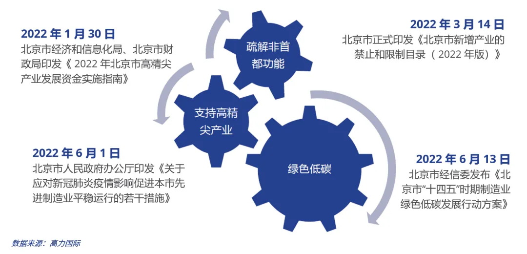 产业政策层面,2022年北京市年度产业政策集中体现在三个关键词上:疏解,支持,绿色低碳。