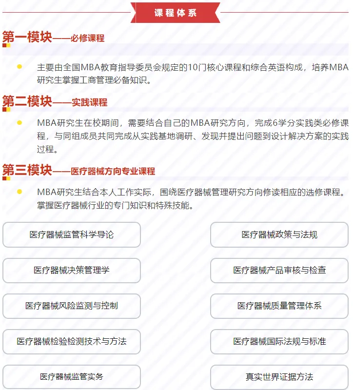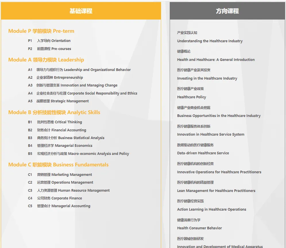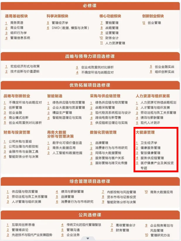 2) 课程设置:健康产业管理变革与实践、大健康产业概论、国际医疗医药市场分析、健康保障制度与产业机遇、精准健康医学与健康管理、国际医疗器械市场分析、健康数据处理与统计分析、健康信息技术与健康管理、医院管理理论与实践、大健康产业管理实践课程;