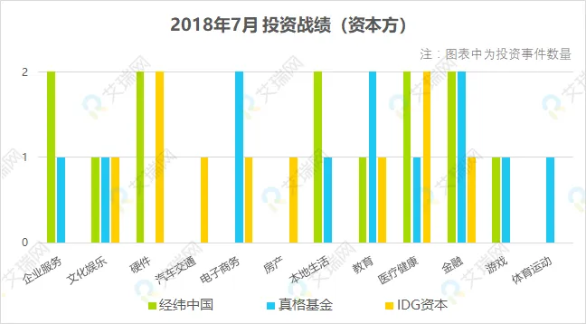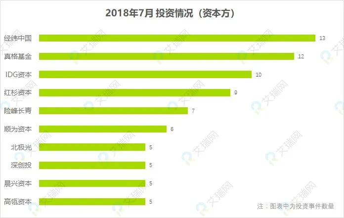 艾瑞网整理2018年7月投资行业事件发现,本月资本方投资行业事件数前三名分别为经纬中国、真格基金以及IDG资本。