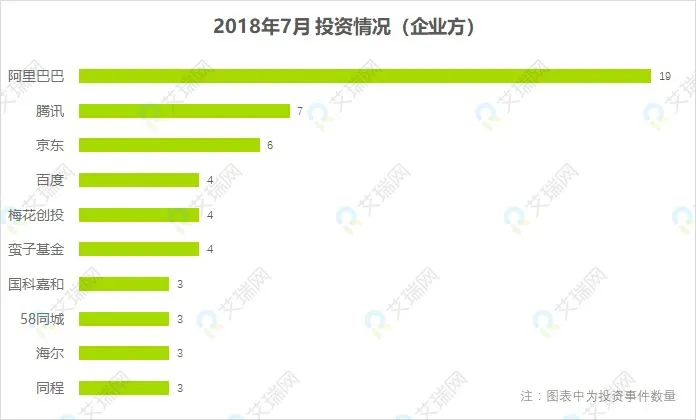 2018年7月投资盘点企业方投资行业事件数前三名分别为阿里巴巴(含阿里系)、腾讯与京东,排名与上月相差无几。