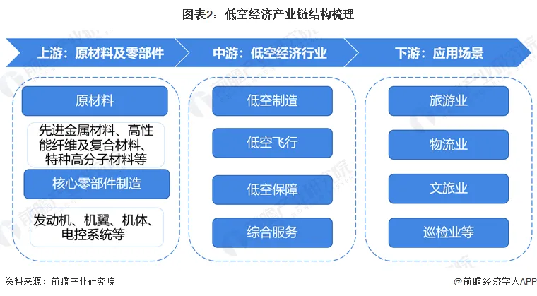 中国低空经济产业链上游为原材料与核心零部件领域,其中原材料包括金属原材料、特种橡胶与高分子材料等;产业链中游低空经济行业包含低空制造、低空飞行、低空保障与综合服务;产业链下游为各种应用场景,包括旅游业、物流业、文旅业与巡检业等。