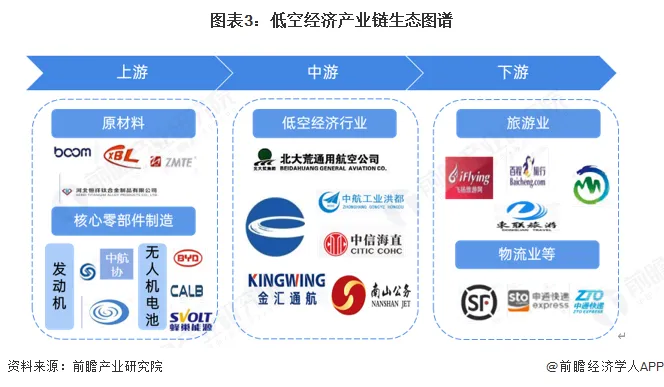 中国低空经济产业链上游原材料领域有企业中美橡胶、西伯力橡胶与恒祥钛合金等,核心零部件制造有企业中航协与钢研高纳等;产业链中游有企业北大荒、中航工业与中信海直等;产业链下游旅游业有百程旅行与东联旅游等企业,物流业有企业顺丰与中通等。