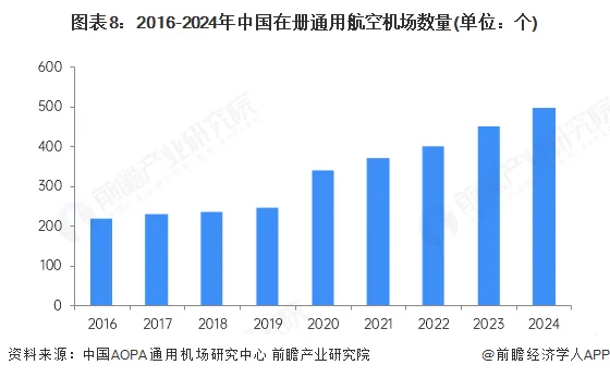 截至2024年底,全国注册及备案的通用航空机场有496个,较2023年的449个增加了近50个。