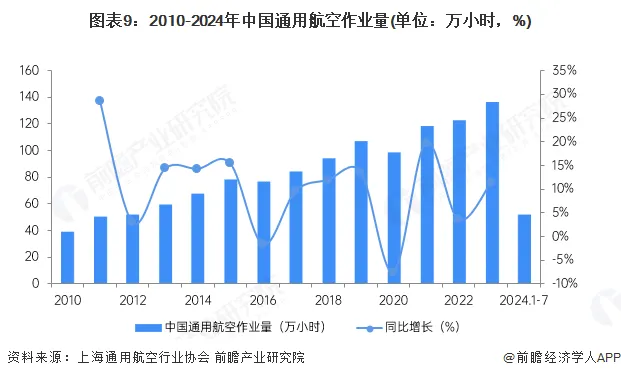2010-2019年,我国通用航空业作业量整体呈增长态势。2020年受全球新冠疫情对航空业的影响,中国通用航空年作业量为98.4万小时,同比下降7.6%。2023年,中国通用航空作业量为135.7万小时,较2022年增长11.3%。2024年1-7月,传统通用航空经营性飞行量共计51.7万小时。