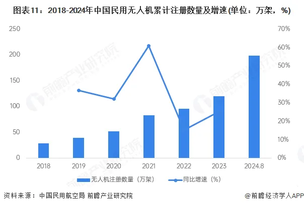 随着我国人均消费水平以及无人机技术水平的提高,公众对智能生活的需求增大,带动民用无人机行业发展,注册数量快速增长。根据中国民用航空局公布的数据,2023年,全国民用无人机注册数量达120万架,同比增长25%。截至2024年8月,民用无人机注册数量达198.7万架,近年来我国无人机注册量增长迅速。