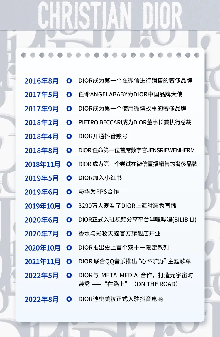 2019年10月,3290万人通过Dior在微博、华为、抖音和腾讯视频的官方账号同步观看2020春夏时装系列上海举办的发布会。其中腾讯视频的直播版本,结合了360度增强现实科技 (AR) ,这是该项技术首次用于奢侈品牌的时装秀。