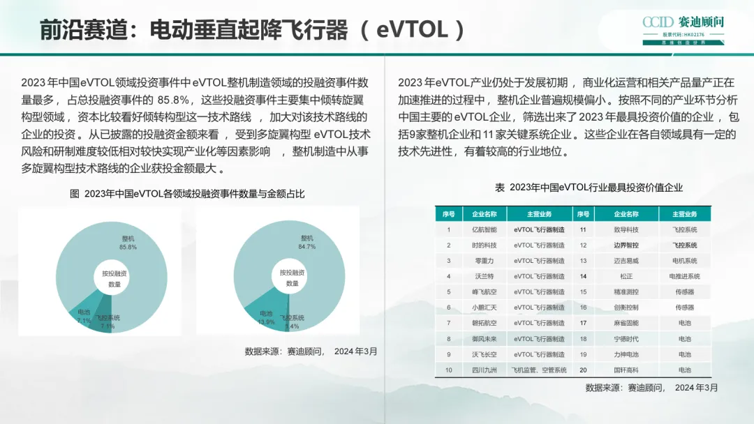 再次,围绕低空经济前沿赛道做了详细介绍。根据测算,2023年中国eVTOL产业规模接近10亿元,民用无人机产业规模接近1200亿元。同时,还介绍了2023年中国eVTOL相关领域投融资信息统计情况,并分享民用无人机产业结构数据,并对低空经济的低空智联网和低空安全产业两条潜力赛道做了简要介绍。