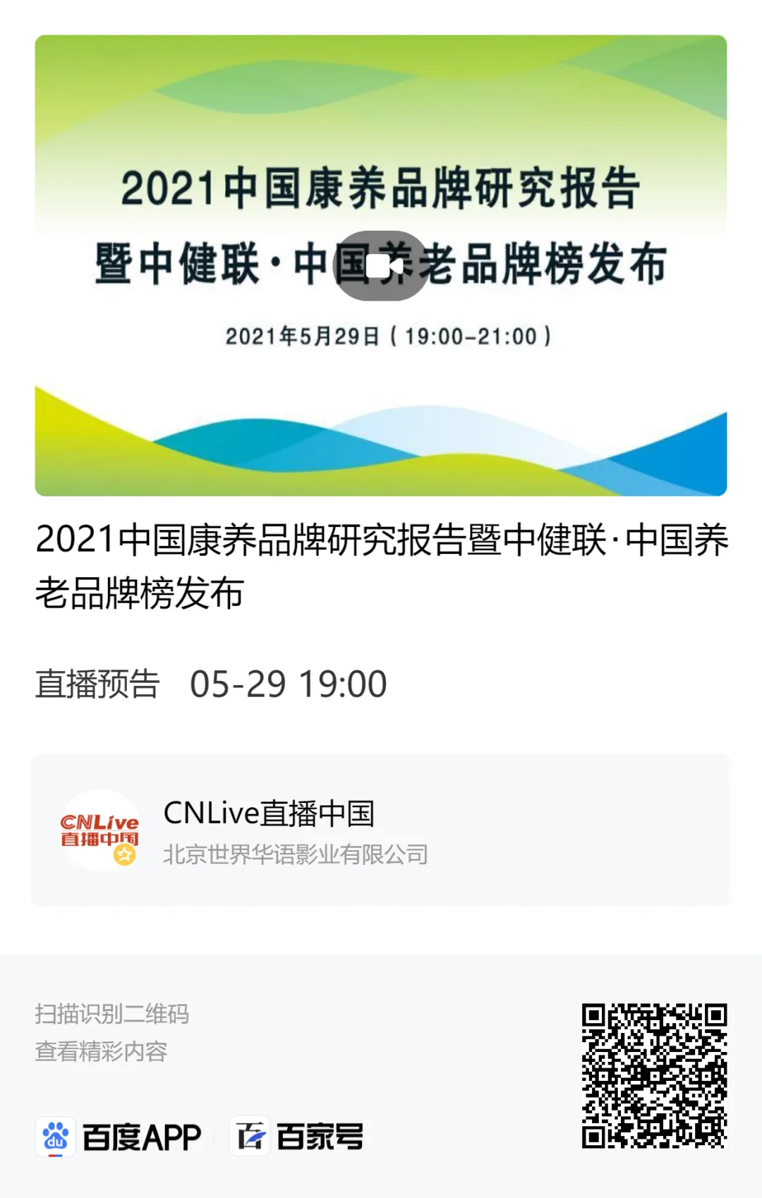 凝聚品牌力量,推动产业发展,点赞中国养老品牌,在中国搜索、中国报道网等媒体的支持下成为我国健康养老产业的重要品牌事件。今天晚上,中国康养品牌研究报告、中健联•中国养老品牌榜“2021中国养老十大品牌”将发布,由中健联康养研究院提供学术支持,国家互联网服务平台中国网++旗下直播中国、健康中国将现场直播,中国报道网健康中国、中国搜索等媒体大力支持,第一视频、有赞、百家号、微博、腾讯直播、视频号、网易号等直播平台将同步进行现场直播。