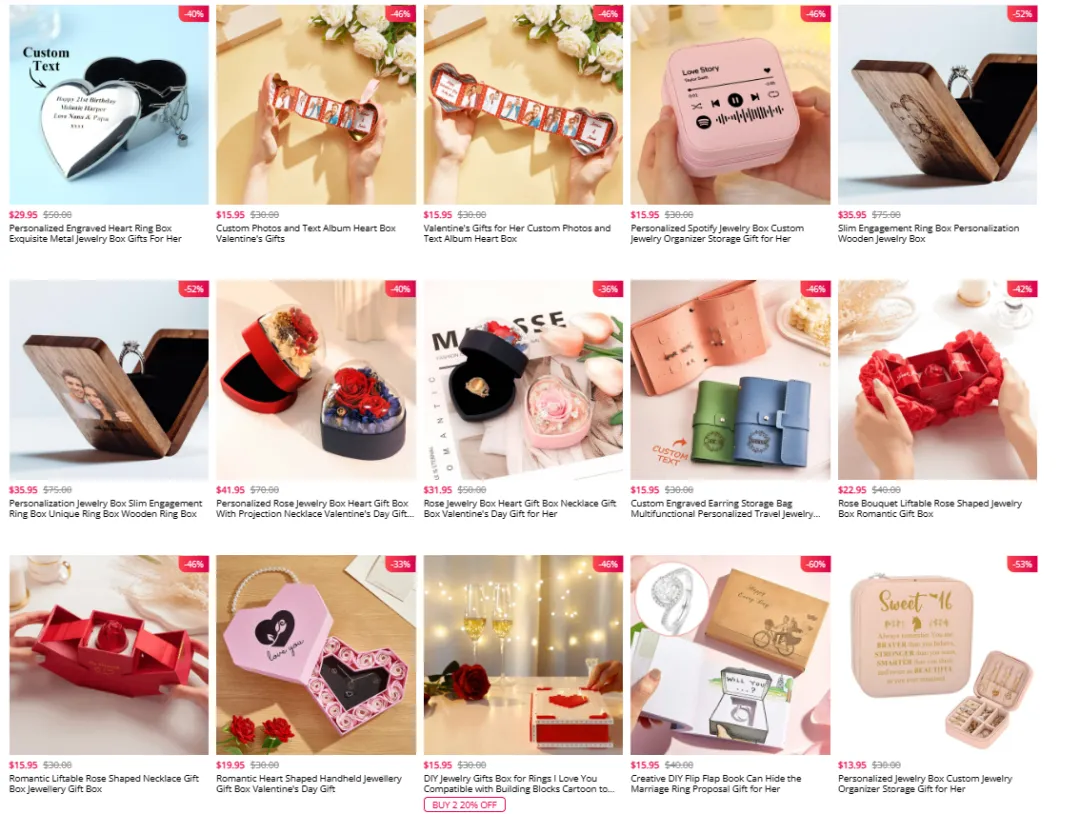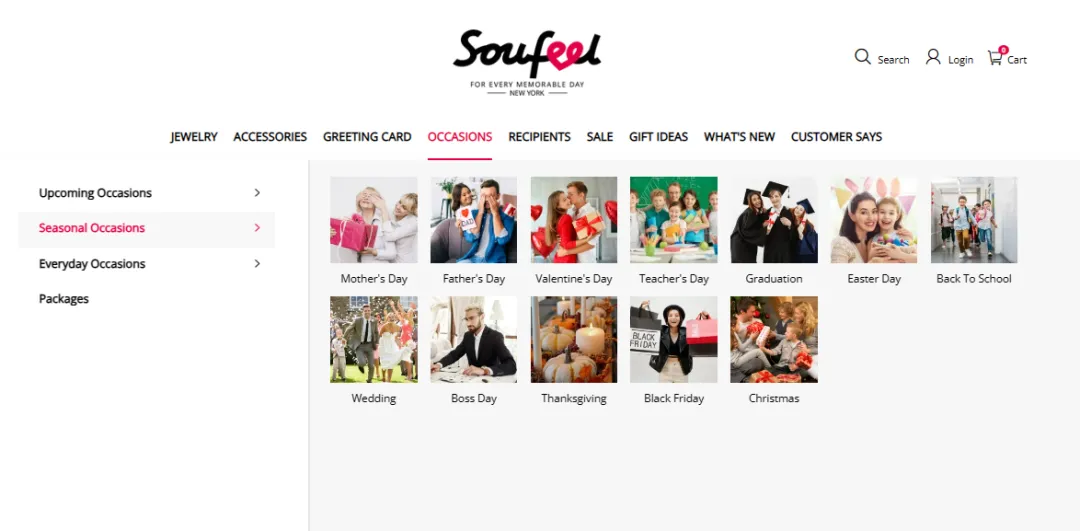 为了进一步打造品牌的独特风格,“Soufeel”的业务范畴在珠宝首饰定制的基础上增加了礼品定制。网站根据不同送礼场景进行了产品划分,便于消费者进行选择,并周到地提供了不同的包装方案。消费者仅需付出几十美元,就可获得一份包装精美、充满心意且具有特殊情感意义的珠宝礼品,这使得“Soufeel”在消费者中建立了良好的口碑。