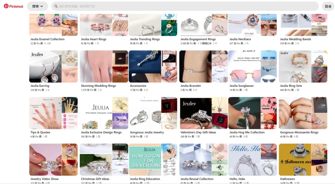 杰莉亚充分利用社交媒体,在宣传上新的同时进行产品分类,如利用“Pinterest”的收藏板功能,将其产品按照首饰类别、节日主题、使用场景等分别建立新的收藏板,默默抓取浏览图片的“隐藏顾客”的需求,并在其后进行针对性的产品开发和营销推广。