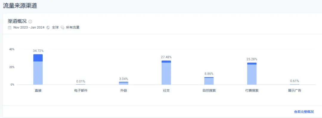 “Soufeel”非常注重营销体系的搭建,根据“similarweb”的数据显示,近三个月来,独立站的访客来源渠道主要是直接搜索、社交媒体和付费搜索,占比分别为34.72%、27.48%及25.28%。直接搜索比例较高,证明品牌建设比较成功,已在消费者中建立了较高的知名度。