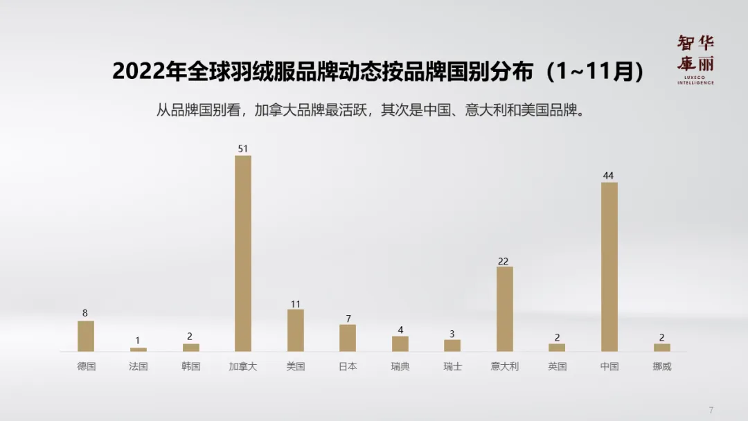 在这些动态中,中国品牌以44条动态数量位居第二,仅次于加拿大品牌,是意大利品牌的两倍。