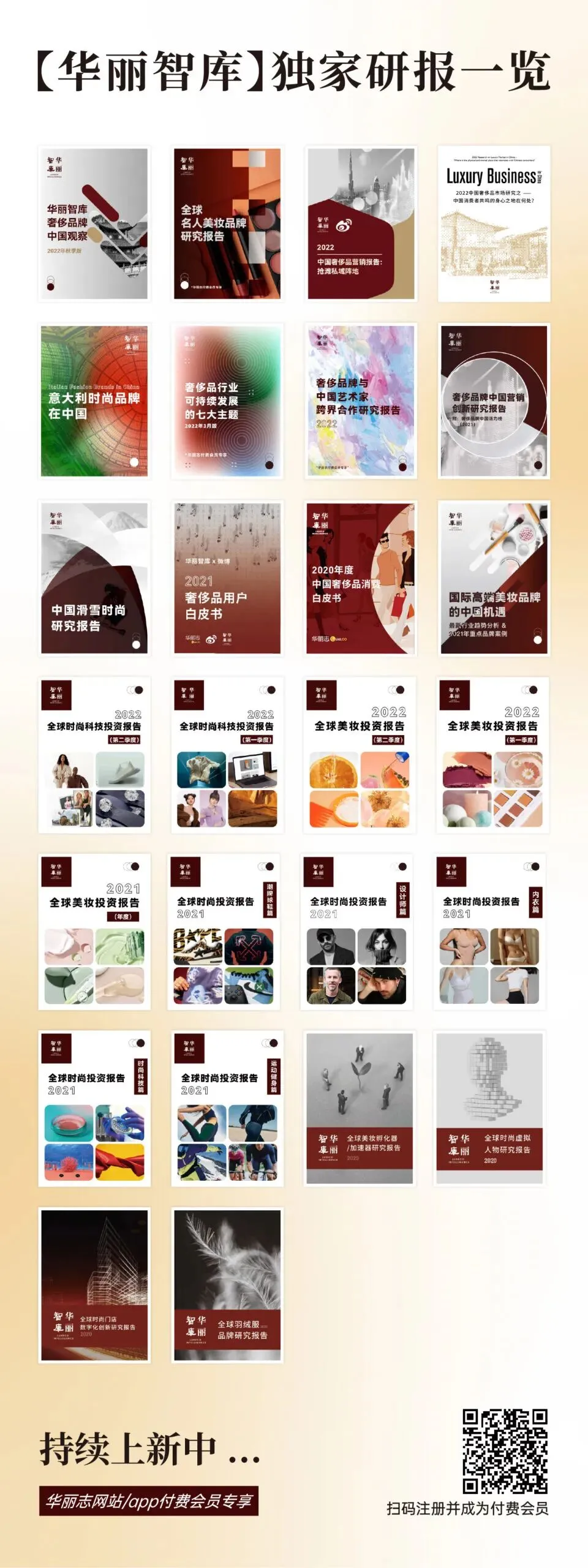 基于我们持续建设的行业网络、数据智能和知识体系,「华丽智库」聚焦奢侈品、时尚、美容和生活方式产业,通过结构化的商业资讯、系统的细分行业研究、高效的一手调研、丰富的实操案例和前瞻的战略思维,为行业领导者提供最佳决策参考。