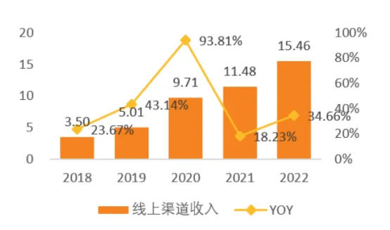 数据显示,22 年公司线上渠道收入为 15.46 亿元,同比大幅增长34.66%。