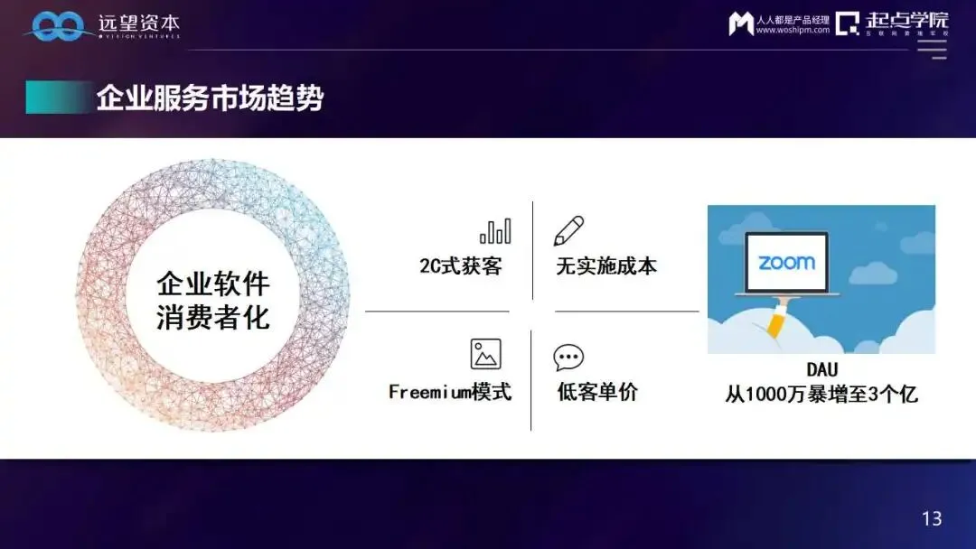 举个例子,传统软件获客都是采用投硬广或登门拜访的方式;但是如今类似ZOOM,却采用了2C式获客,从线上广告、朋友推荐等地方下载,没有任何实施成本,下载安装注册了就能用,并且是采用Freemium模式,免费也能用(受限),但客户可以选择交费去享受更高端的服务。