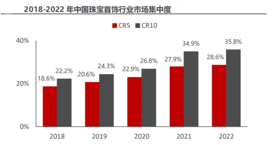 数据显示,2022年,我国黄金珠宝行业的前五家企业的份额为 28.6%,较2018年提升10个百分点,前十家仅为35.8%,较2018年提升14个百分点。