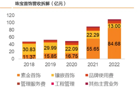 公司积极的调整业务结构,开始发力黄金首饰,导致黄金营收占比迅速提升,2022年营收占比提高到了76%,保持住了营收的持续增长。