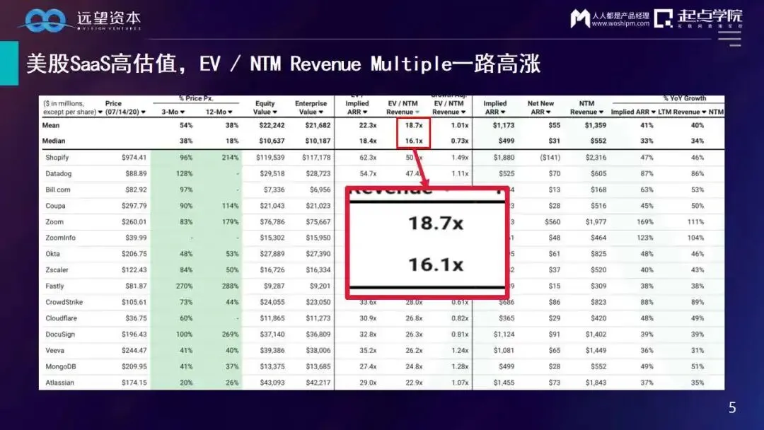 大家都知道这两年To B赛道真的很火热,我们可以从美股SaaS公司看到,去年很多To B SaaS企业都突破了百亿美金;下表中可以看到标出的部分也就是EV/NTM Revenue,也就是企业的市值除以未来一年的预期收入;平均18.7x,中值 16.1x;所以说美股市场给了SaaS企业服务的公司非常高的市值。