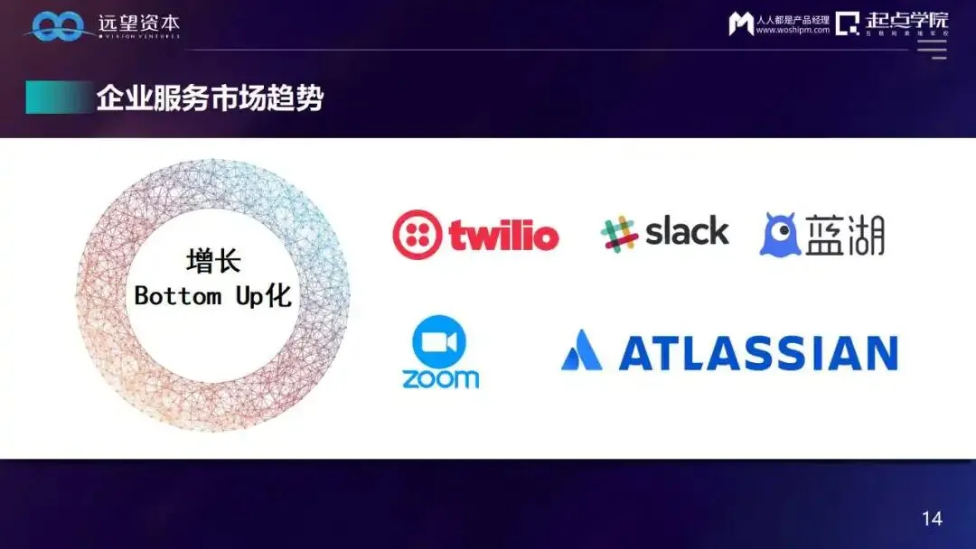 也就是从底至上,现在很多公司使用企业服务软件是从基层开始使用的,不像以前卖软件你得先搞定CEO,现在比如twilio、zoom、slack等等,哪一个是老板告诉你用的?基本都是员工自发的开始使用。