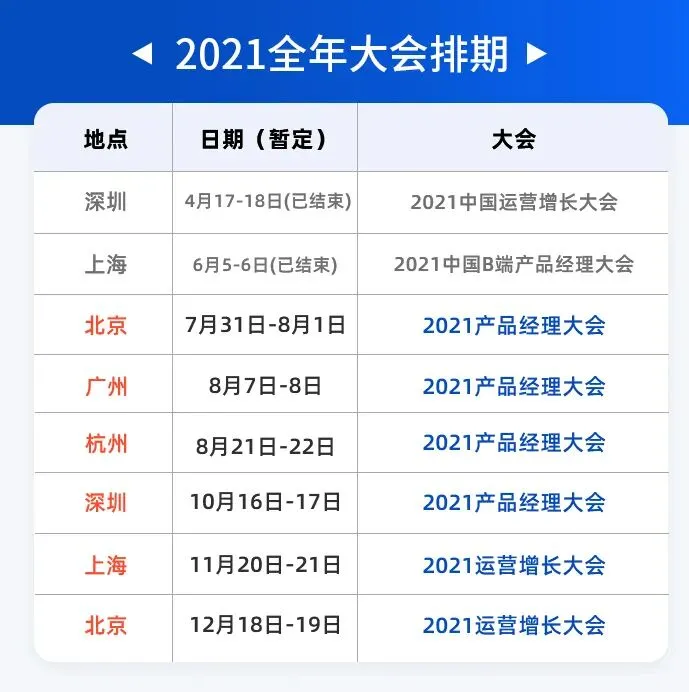 2021年全年产品经理大会、运营增长大会售票启动,北、上、广、深、杭五城巡回,最后六场!