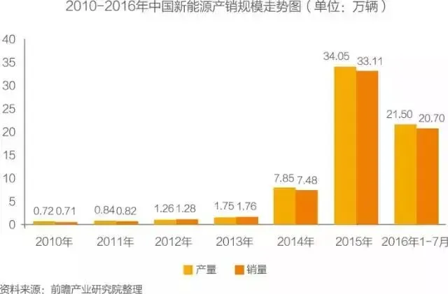 2010-2015年,我国新能源汽车产销规模逐年增长,且增长速度较快。2015年新能源汽车产销340471辆和331092辆,同比分别增长3.3倍和3.4倍。2016年1-7月,新能源汽车产销21.5万辆和20.7万辆,同比增长119.8%和122.8%。