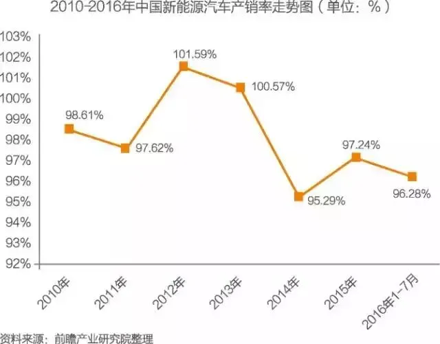 2010-2016年,我国新能源汽车产销率呈现波动性,范围在95%-102%之间。2015年,我国新能源汽车产销率97.24%,较上年相比增长1.95个百分点。2016年1-7月,新能源汽车产销率有所下降,为96.28%,较2015年底相比下降0.96个百分点。