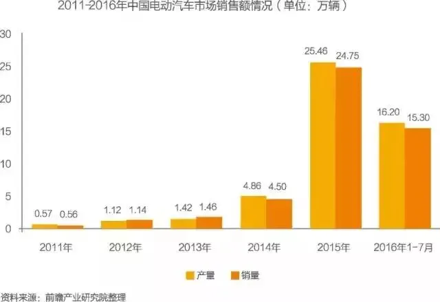 2011-2015年,我国纯电动汽车产销规模大幅增加。2015年,纯电动汽车产销254633辆和247482辆,同比增长4.2倍和4.5倍。2016年1-7月,纯电动汽车产销16.2万辆和15.3万辆,同比增长156.4%和160.9%。