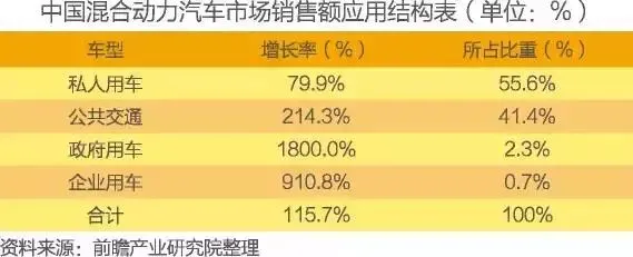 从应用结构的角度来看,私人用车在SUV增长的带动下保持了较高的增长速度,占据了最大的市场份额,达到55.6%,增长速度保持稳定。公共交通混合动力汽车销售额增长很快,达到214.3%,市场份额有所提升,达到41.4%。而政府用车和企业用车等新兴市场开始启动,销售额增长出现井喷。