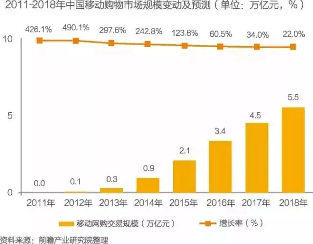 未来几年,中国移动网购仍将保持较快增长,2018年移动网购市场交易规模将超过5万亿元。移动端的随时随地、碎片化、高互动等特征,让移动端成为纽带,助推网购市场向“线上+线下”,“社交+消费”,“PC+手机+TV”,“娱乐+消费”等方向发展,实现整合营销、多屏互动等模式。