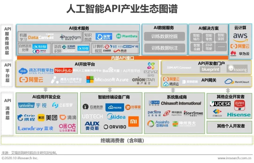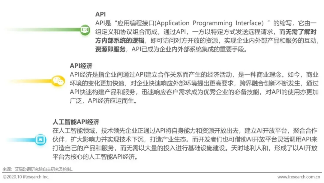 人工智能API经济商业价值:AI与传统行业的邂逅已无处不在,API在产业链的快速拆分重组、行业分层细化、加速融合创新过程中发挥了极大作用,技术领先企业通过AI开放平台将自身能力和资源开放出去,打造产业生态,形成规模经济和长尾经济。