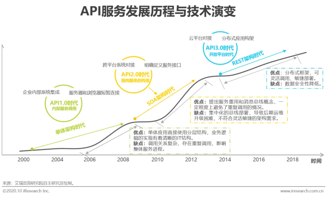 API服务的发展历程也可以看做企业数字化过程中系统集成需求不断变化的过程。21世纪初期随ERP、CRM等企业内部管理系统的普及,各类系统沉淀了海量的关联数据,基于早期的数据库和http1.0通信协议,API开始在企业内部数据打通展露头角,系统集成进入API1.0时代。2007年前后,随web2.0时代到来,企业信息和资源跨出企业内部,各企业系统不再是孤立状态,系统资源和数据的整合需求也扩散至外部,进而出现了UDDI技术规范和基于SOAP协议的API接口,系统集成步入API2.0时代。2015年后,云服务主导了企业服务市场,大型企业在内部系统集成理顺的基础上,将企业核心资源以带有适当安全和监管措施的“API+云服务”形式向合作伙伴、客户、乃至普通大众输出。基于此,RESTful API开始被大量应用,API服务正式步入3.0时代。API3.0时代,客户和普通大众可以利用企业通过API输出的资源来完成各自的产品和服务的开发,最终延伸出庞大的价值链。