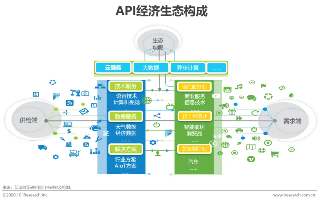 API经济指企业间通过API建立合作关系而产生的经济活动。API产品供给端、需求端和API经济得以发展的生态设施支持,构成了API经济生态。API产品供给端主要是掌握了一定数据、内容、技术资源的企业及政府机构建立的开放平台;需求端则极其广泛,按需求主体维度,包括开发者、企业用户和个人用户;按产品维度,则囊括了各行各业各类产品和系统,如网站、汽车、家电、可穿戴设备等等,可接入互联网的设备或系统都可使用API;此外,API经济的发展也离不开云服务、大数据、异步计算等技术发展的生态设施支持。