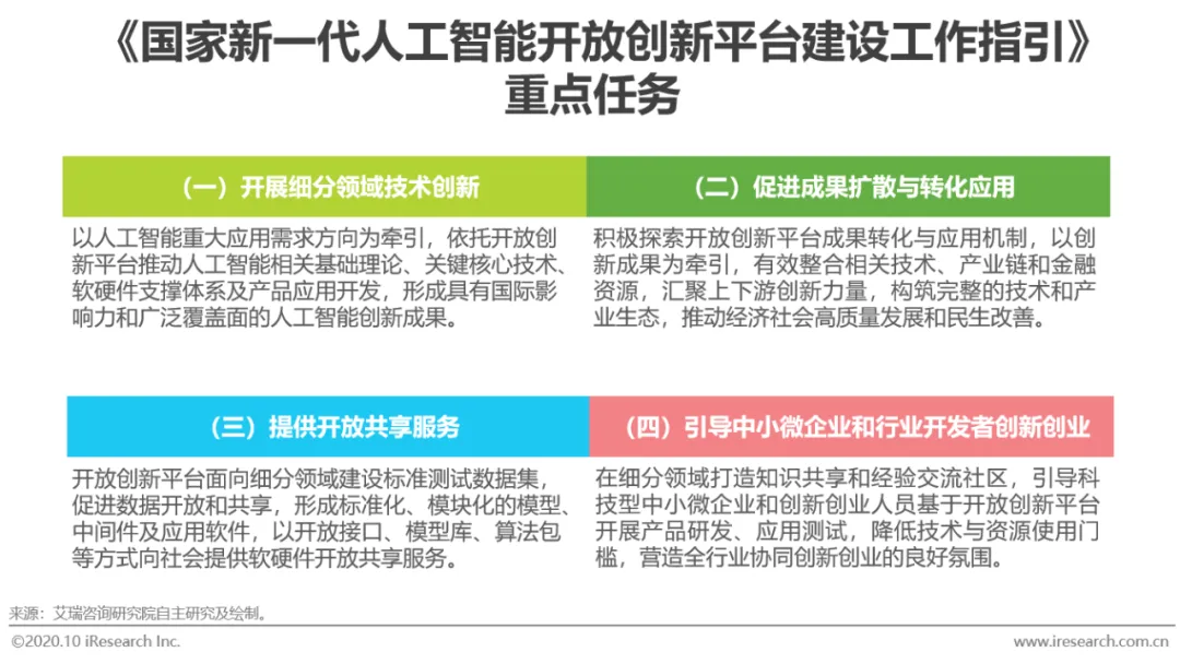 基于35号文,充分发挥人工智能行业领军企业、研究机构的引领示范作用,促进人工智能与实体经济的深度融合,进一步推进国家新一代人工智能开放创新平台建设,推动我国人工智能技术创新和产业发展,2019年8月,科技部正式发布《国家新一代人工智能开放创新平台建设工作指引》(国科发高【2019】265号),将“协同式创新”确立为基本原则之一,并提出了围绕人工智能开源开放建设的四大重点任务。政策端自上而下地推动着人工智能开放平台的发展。
