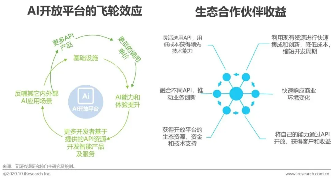 在商业环境瞬息万变,企业间竞合加深的大背景下,API经济对于API资源提供方和生态合作伙伴都有巨大的商业价值。对于以AI开放平台为主的API资源供给方,其可以开放基础设施给更多的开发者,随着开发者数量和应用产品的增多,也将形成相应的网络效应带来更多的用户和盈利,形成增长飞轮,让基础设施自身带来技术红利。对于生态合伙伙伴,其亦可借助平台的优质基础设施及生态资源支持,开拓属于自身的利基市场,获得相应经济收益。