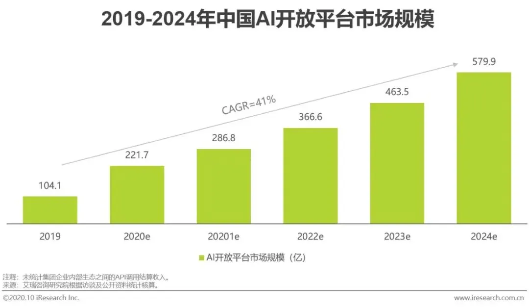 据艾瑞咨询统计核算,2019年人工智能开放平台市场规模达104.1亿且正处于高速增长期,预计到2024年市场规模有望达到579.9亿,未来5年CAGR高达41%。人工智能开放平台及相应的API服务正成为实现AI技术下沉,“飞入寻常百姓家”的重要渠道。对于开放平台而言,除直接的经济收益外,开放平台API服务亦为技术厂商带来了打造产业生态、聚拢合作伙伴、扩大市场影响力、加速创新等巨大的隐形收益。