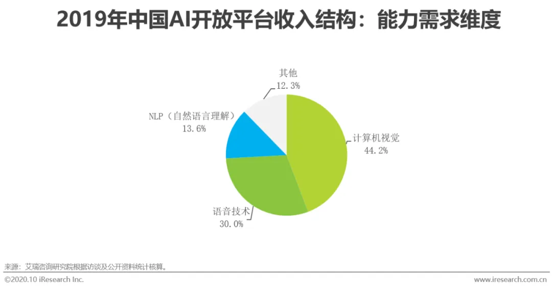 艾瑞咨询核算数据显示,按技术需求维度划分,2019年,计算机视觉、语音技术、NLP对开放平台收入贡献的比重分别为44.2%、30%和13.6%,计算机视觉贡献最大。一方面,相较于语音技术,计算机视觉技术价格更高;另一方面,计算机视觉技术当前应用领域更广泛,且在安防、智慧园区、智慧城市等领域有了相对成熟的落地场景。