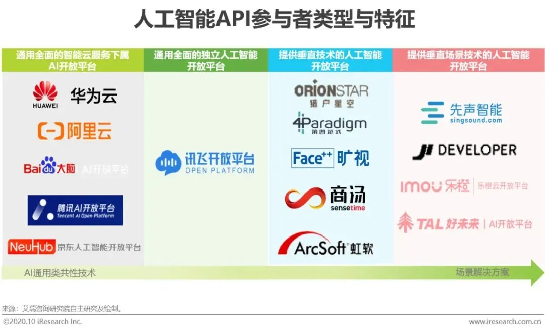 目前,我国人工智能开放平台参与者众多,综合参与者背景和开放技术类型,可大体分为四类:通用全面的智能云计算下属AI开放平台,如阿里云、百度云、腾讯云等下属的AI开放平台;通用全面的独立人工智能开放平台,如讯飞开放平台、小米开放平台等;提供垂直技术的人工智能开放平台,如专注计算机视觉的旷视科技Face++、商汤科技等;以及提供垂直场景技术的人工智能开放平台,如安防场景的海康威视、大华股份乐橙开放平台、教育场景的好未来AI开放平台等。