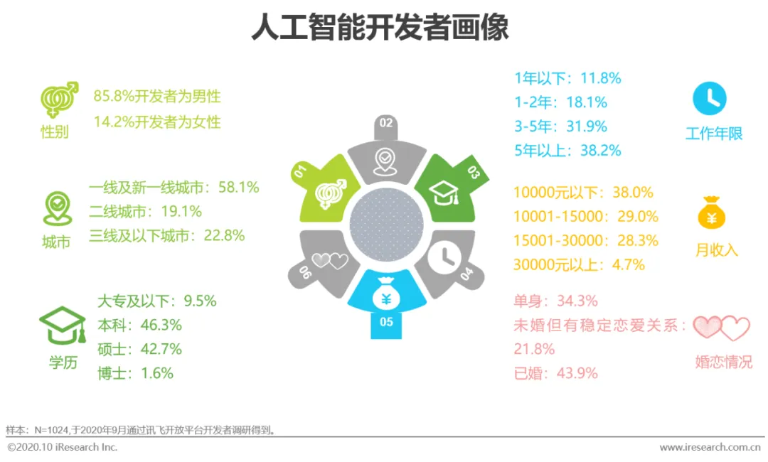 超八成的AI开发者为男性,学历以本科和硕士为主,他们超六成都是职场小鲜肉,近30%工作不足2年,32%左右工作3-5年,且超三成仍为单身、超五成未婚。近六成(58.1%)的开发者工作在一线及新一线城市。