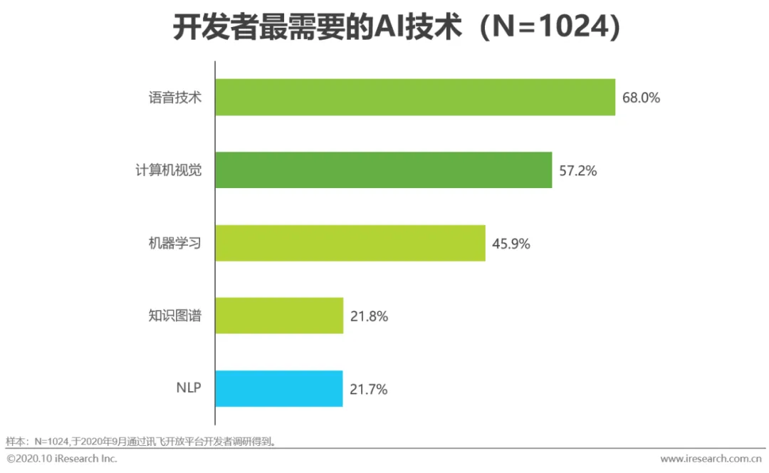语音技术和计算机视觉技术是开发者需求最多的两大AI技术。语音方面,语音识别和语音合成需求最大;CV方面,人脸识别、图像技术和行为识别需求最广。基础技术能力需求上,机器学习的需求占比45.9%,可见智能应用市场对于推理预测,分类和降维等AI功能的依赖程度将更高。