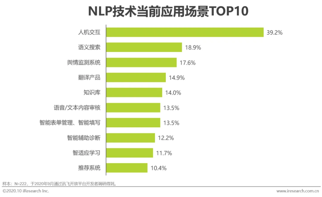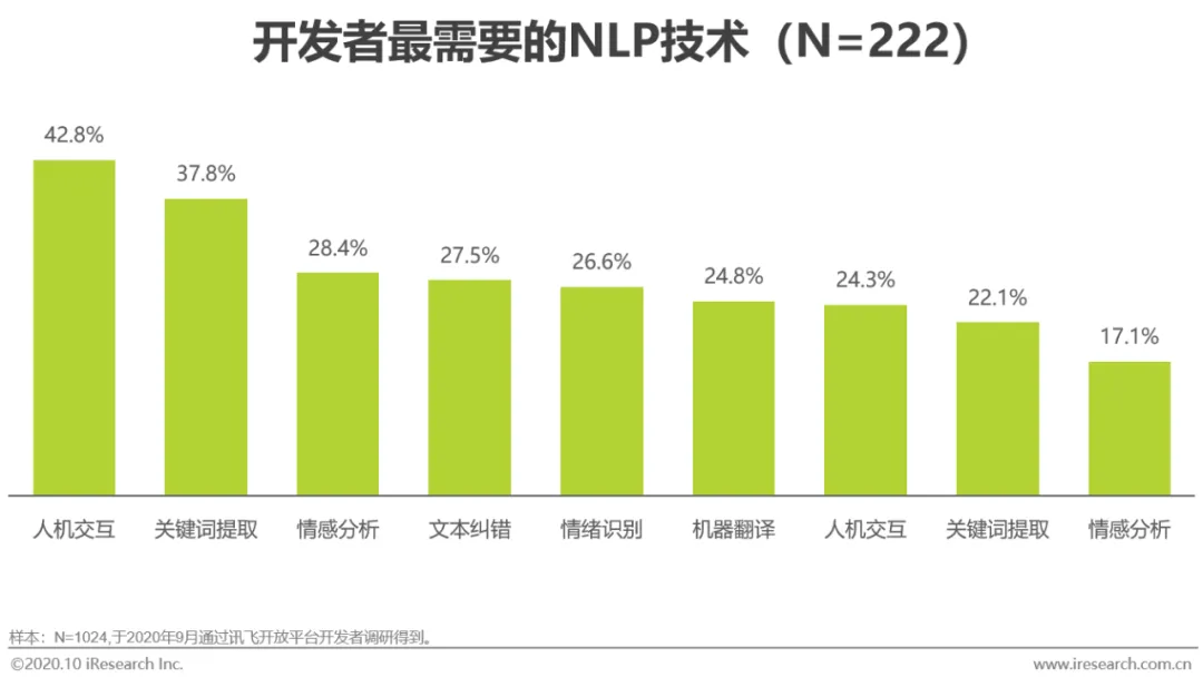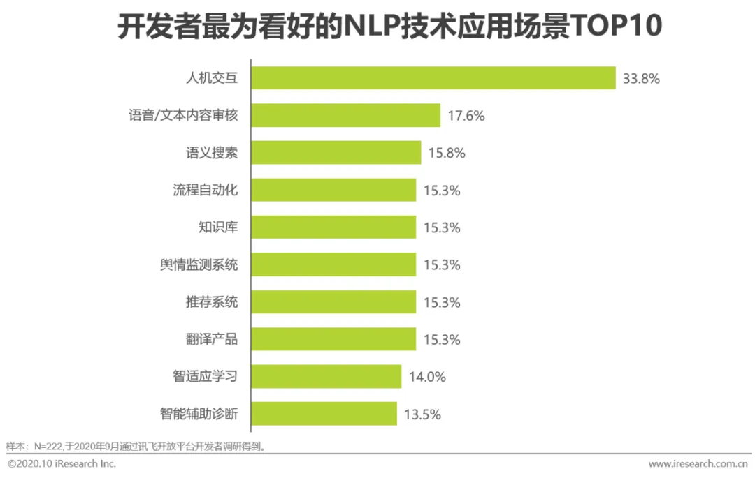 NLP技术的应用中,无论是受访开发者目前的应用场景抑或是最为看好的应用场景,人机交互都遥遥领先。而NLP目前在语义搜索、舆情监测、翻译产品中的应用范围大体相当。根据受访开发者的判断,后续NLP在语音/文本内容审核场景中的应用将有较大程度的提升。