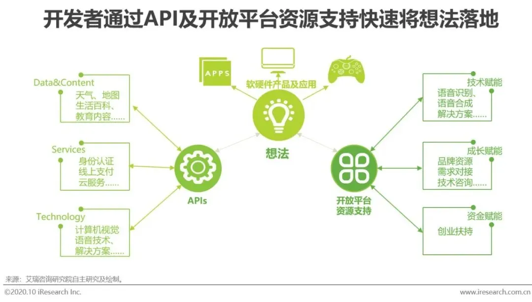 开发者利用其在特定场景的Know-How并结合外部API接口快速构建应用的解决方案,获得人工智能应用市场更多的商业机会,人工智能开放平台也成为了AI开发者们“获得外部资源支持,深化核心技术能力,快速响应用户需求”的制胜法宝。